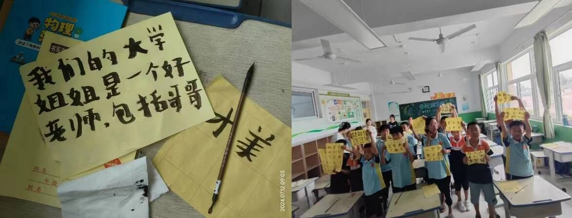 7月12日上午,服务队为孩子们准备了毛笔与宣纸,带领孩子们观看书写毛笔字的相关视频,指导他们的握笔姿势并叮嘱书写毛笔字的注意事项。孩子们都怀着好奇的心态积极尝试,在宣纸上认认真真、一笔一划地书写,天性好动的小朋友们在那一刻竟也安静沉稳起来,深刻体会着毛笔字的魅力。随后,“老师”为孩子们仔细讲解了汉字的起源与发展,孩子们都认真聆听并踊跃回答问题,一问一答的互动使得课堂氛围十分活跃。本次课堂让孩子们深刻地感受了汉字的智慧与魅力,更加深了对中华文明的敬畏之心,自豪之情。