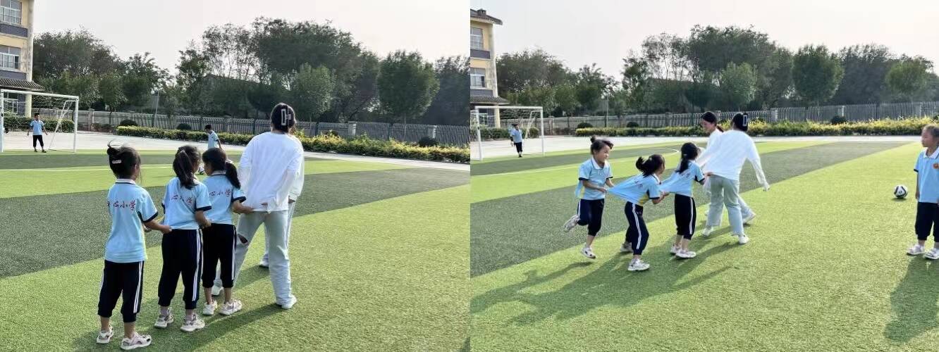 课堂伊始,志愿者与小朋友们共同进行了足球传递与老鹰抓小鸡的游戏,孩子们在“老师”的带领下愈发放得开,展现出蓬勃活力,整个操场充满欢声笑语。这些游戏既让小朋友们体会到团队协作的重要性,也锤炼了他们沟通交流的能力。