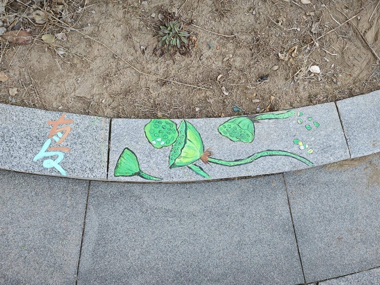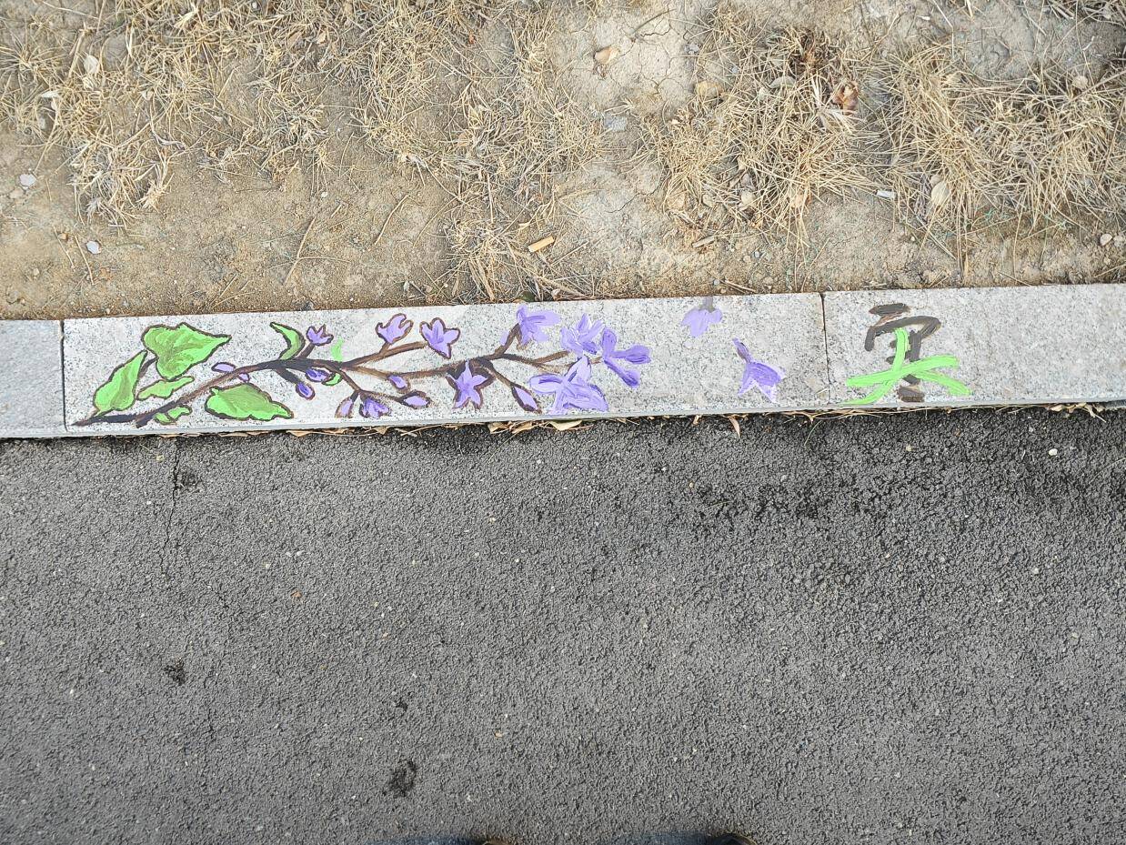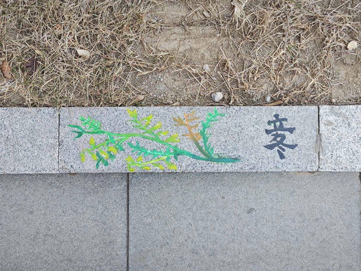 活动现场,二十余名志愿者摇身一变,成为了“校园画师”。他们手持画笔,以环保丙烯颜料为灵动的媒介,在路沿石上精心勾勒。薄荷在小满时节舒展身姿,玉竹于处暑时分散发淡雅,每一幅图案都精准对应着节气的物候,巧妙融入《本草纲目》中记载的药用植物元素,仿佛将古老的本草智慧从泛黄的书页中唤醒,赋予它们鲜活的生命力。除了精美的本草图案,志愿者们还精心绘制了相关创意字,大寒、处暑、惊蛰、小满……这些文字与图案相互映衬,让平凡的路沿石瞬间化身为一件件珍贵的艺术品,为校园文化注入了源源不断的新活力。