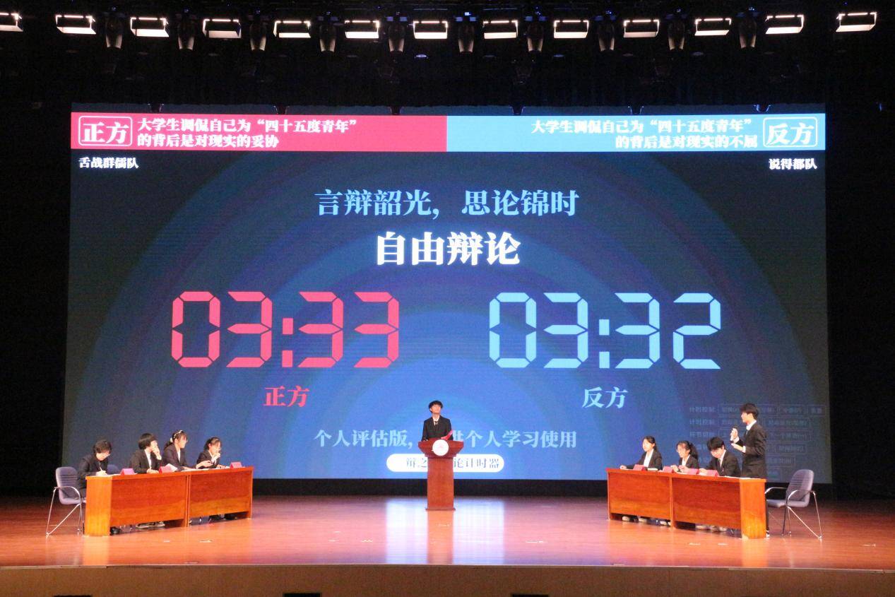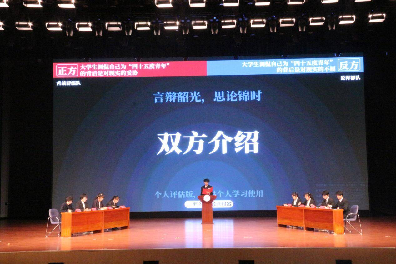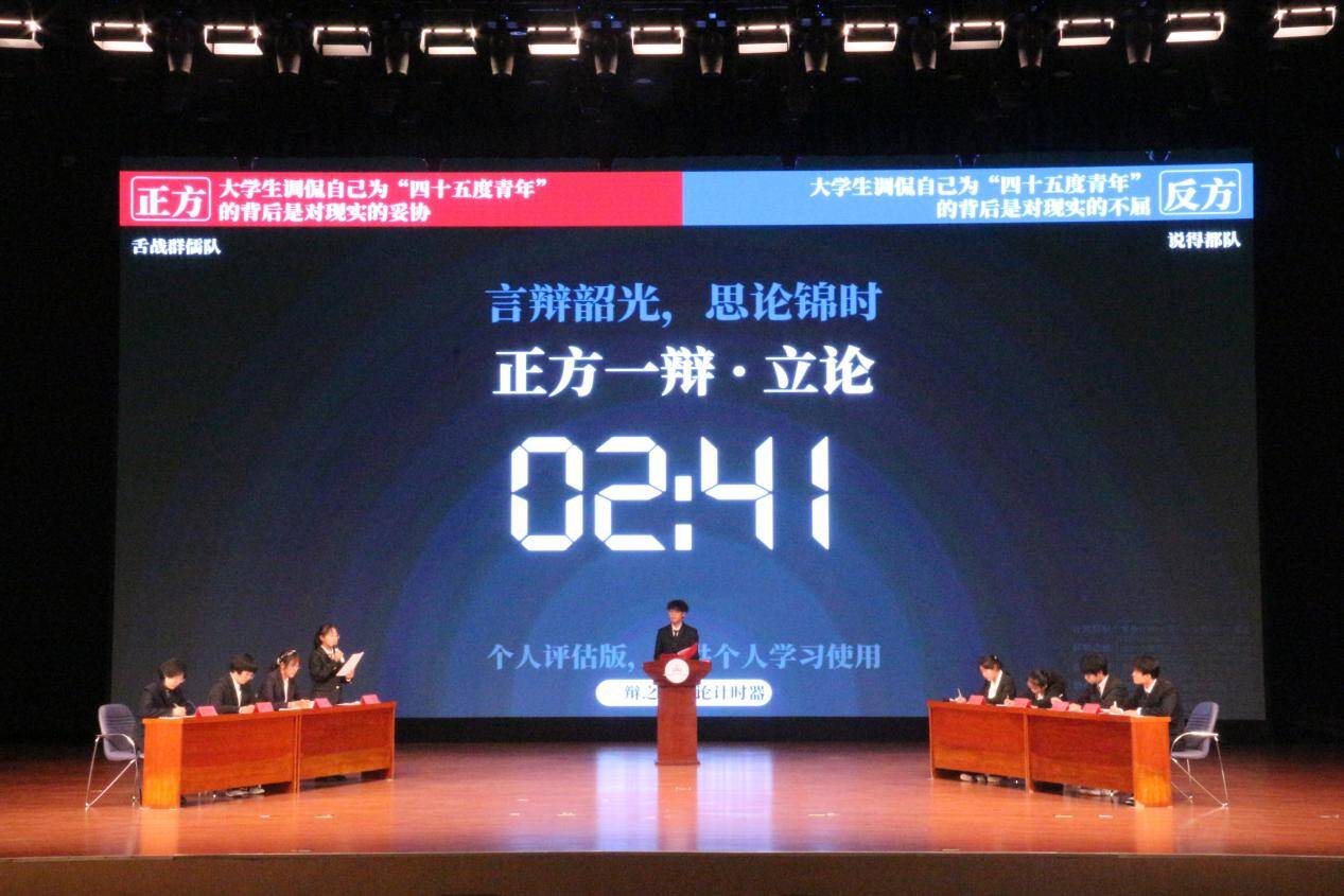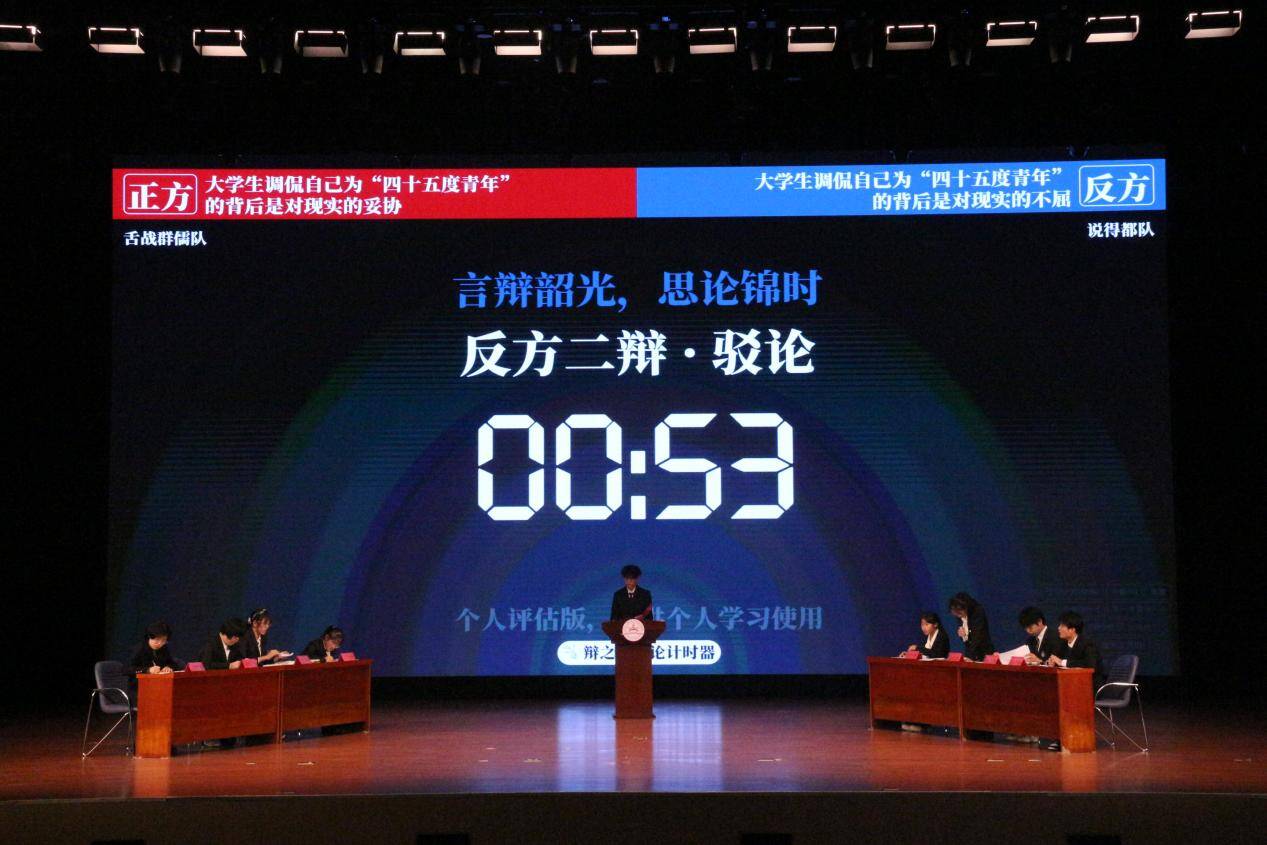 辩黑白曲折之理,论古今中外之事。赛场上,辩手们妙语连珠,以犀利的语言直抵问题要害,以深入的思考展现家国情怀。且看“舌战群儒队”与“说的都队”的精彩对决,就“大学生调侃自己为‘四十五度青年’的背后是对现实的妥协/不屈”一题,以言语铸锋锷,青春之思振掠辩场;来观“该队名已被注册队”和“发际线保护者联盟”旗鼓相当,辩如火荼,对“能/不能通过事情的成功与否判断一个人是否努力”进行深度剖析;再听“从容应队”和“灰化肥会挥发黑队”句句精辟,辞藻华丽,就“人生的遗憾需要尝试补偿/学会放手”这一人生议题展开思想博弈。每轮赛程,双方辩手引经据典,逻辑严密,经过互相攻防的三辩质询与小结之后,精彩的自由辩彻底将比赛推向高潮。正方辩手旁征博引,妙语连珠,反方辩手则言辞犀利,化解自如。整场比赛中,双方你来我往,唇枪舌战,展示了卓越的逻辑思维和出色的应变能力。每当一方抛出犀利观点,另一方便迅速反击,场面扣人心弦。随着计时器的提示音响起,辩论赛在高潮中落下帷幕,紧张的气氛逐渐平息,礼堂内顿时爆发出雷鸣般的掌声,经久不息。