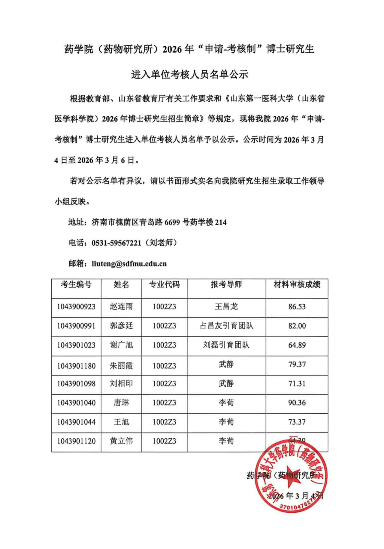 药学院(药物研究所)2026年“申请-考核制”博士研究生进入单位考核人员名单公示