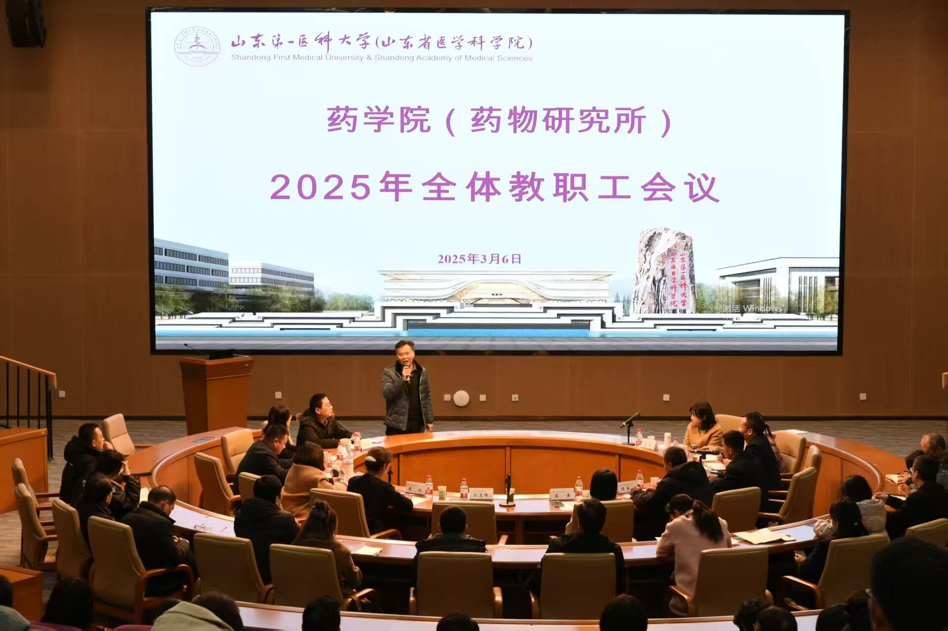 2025年3月6日,山东第一医科大学药学院(药物研究所)全体教职工会议在药学楼报告厅举行,会议邀请了附属省立医院、第一附属医院、附属肿瘤医院、附属中心医院药学部领导参加并作交流发言,旨在加强学院与医院的沟通与协作,共同推动药学教育与科研事业的发展。