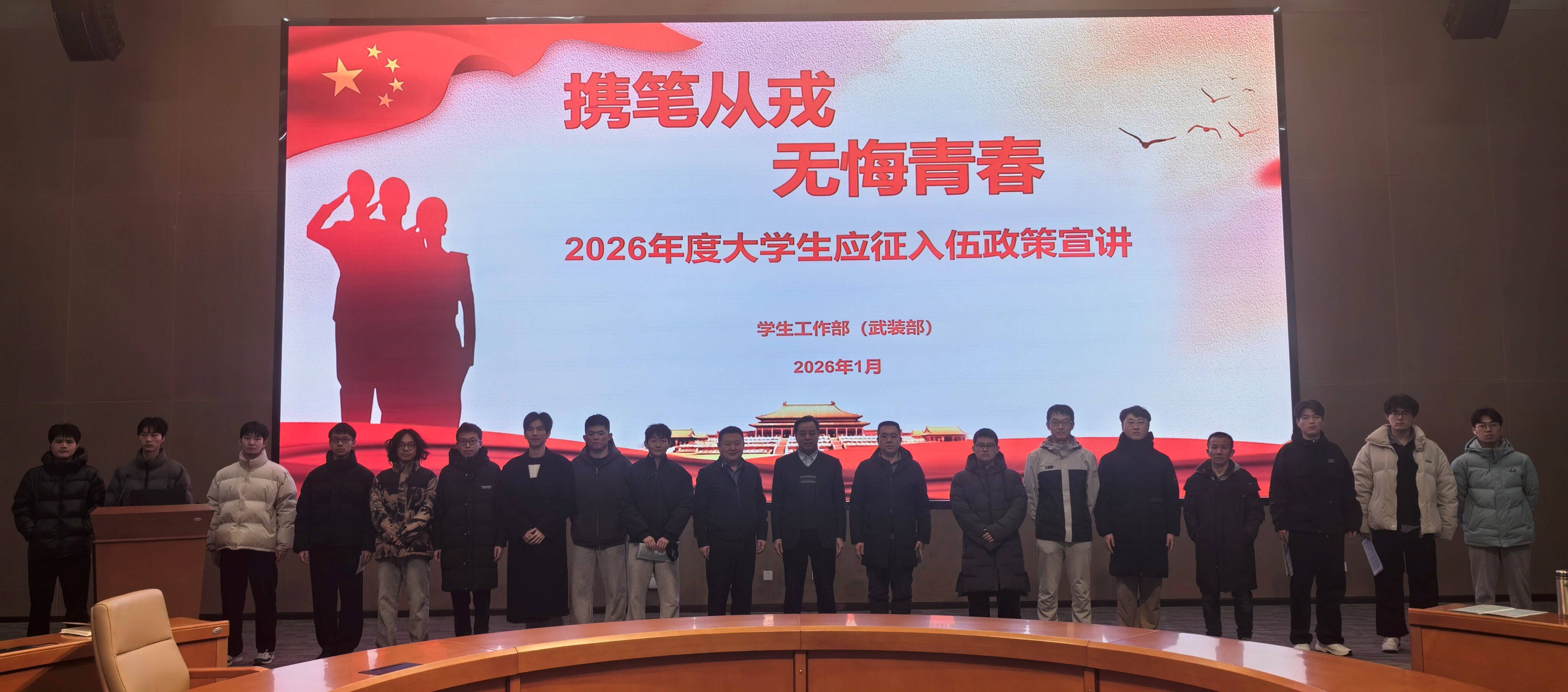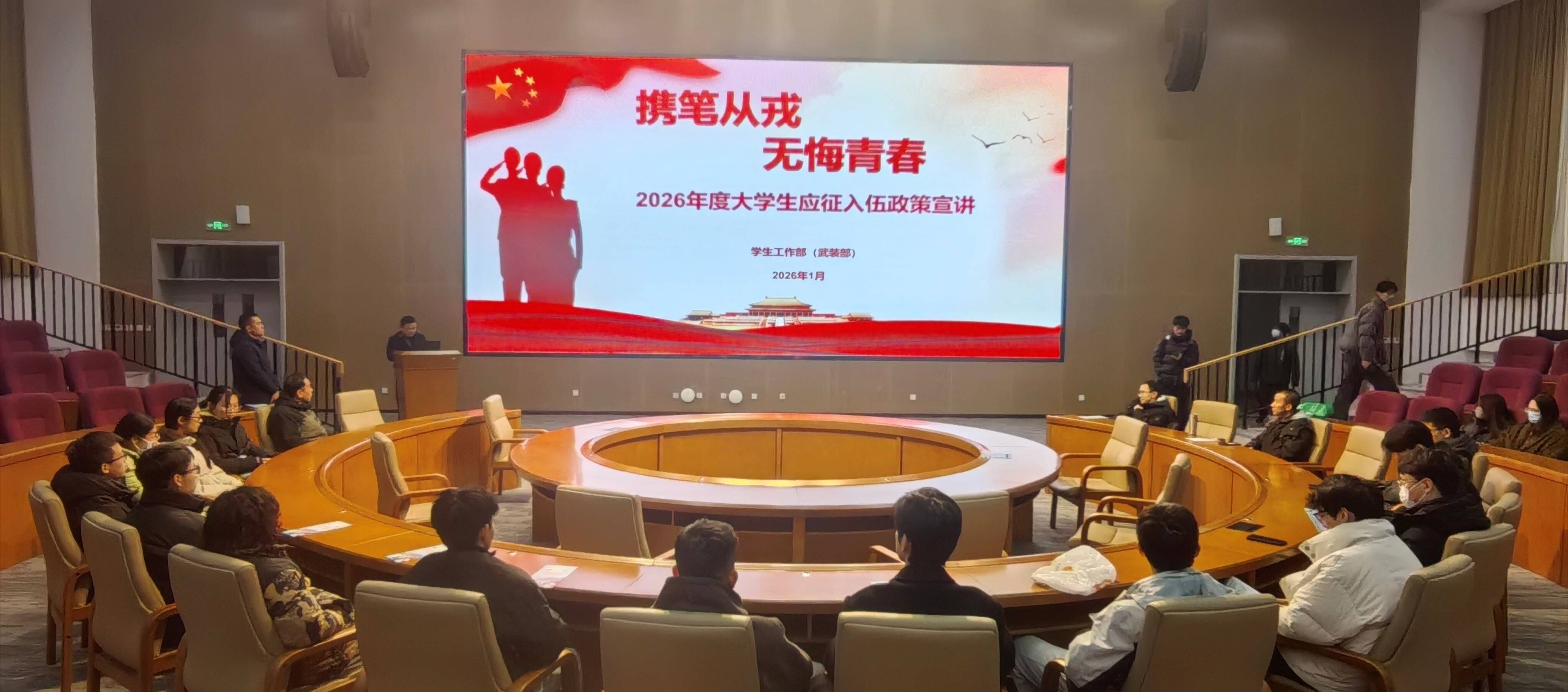 为促进2026届毕业生更加深入地了解征兵政策,激发毕业生优秀学子参军报国热情,1月14日,药学院(药物研究所)邀请学生工作部刘方永副部长、安文老师到学院组织征兵政策宣传,院(所)党委副书记罗树启主持会议,辅导员代表、毕业生代表参加活动。