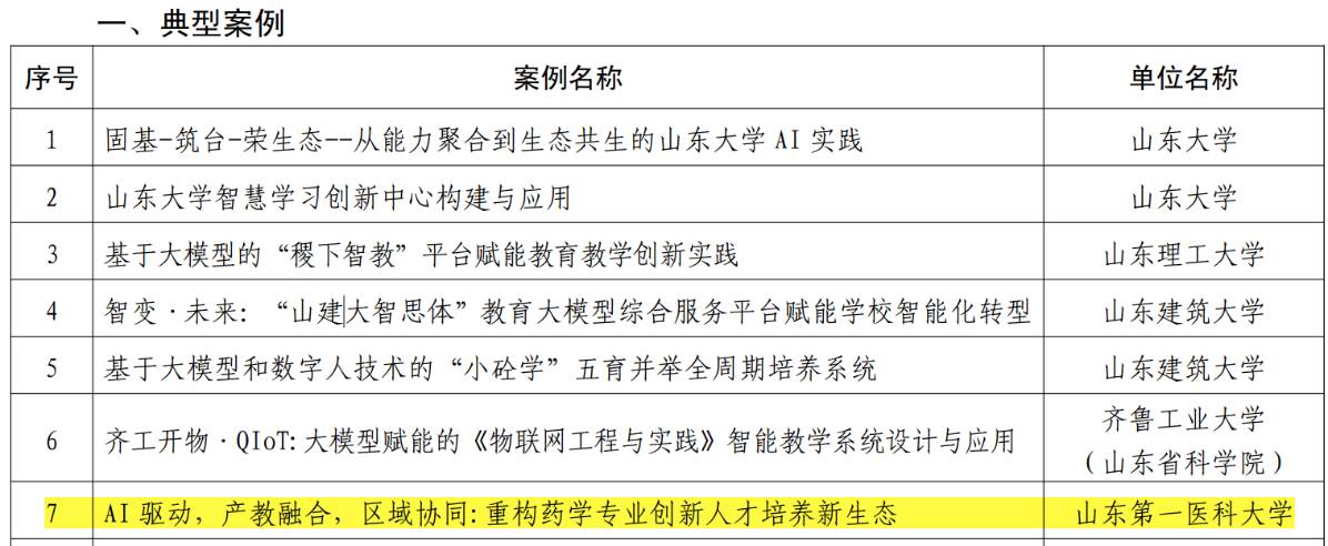 近日,山东省教育厅发布《关于推广人工智能大模型赋能教育典型案例及创新应用场景的通知》,公布全省人工智能大模型赋能教育典型案例评选结果。药学院(所)李福荣教授牵头,联合药物化学、药理学、药物分析与药剂学等骨干教师共同完成的案例《AI驱动,产教融合,区域协同:重构药学专业创新人才培养新生态》成功入选。