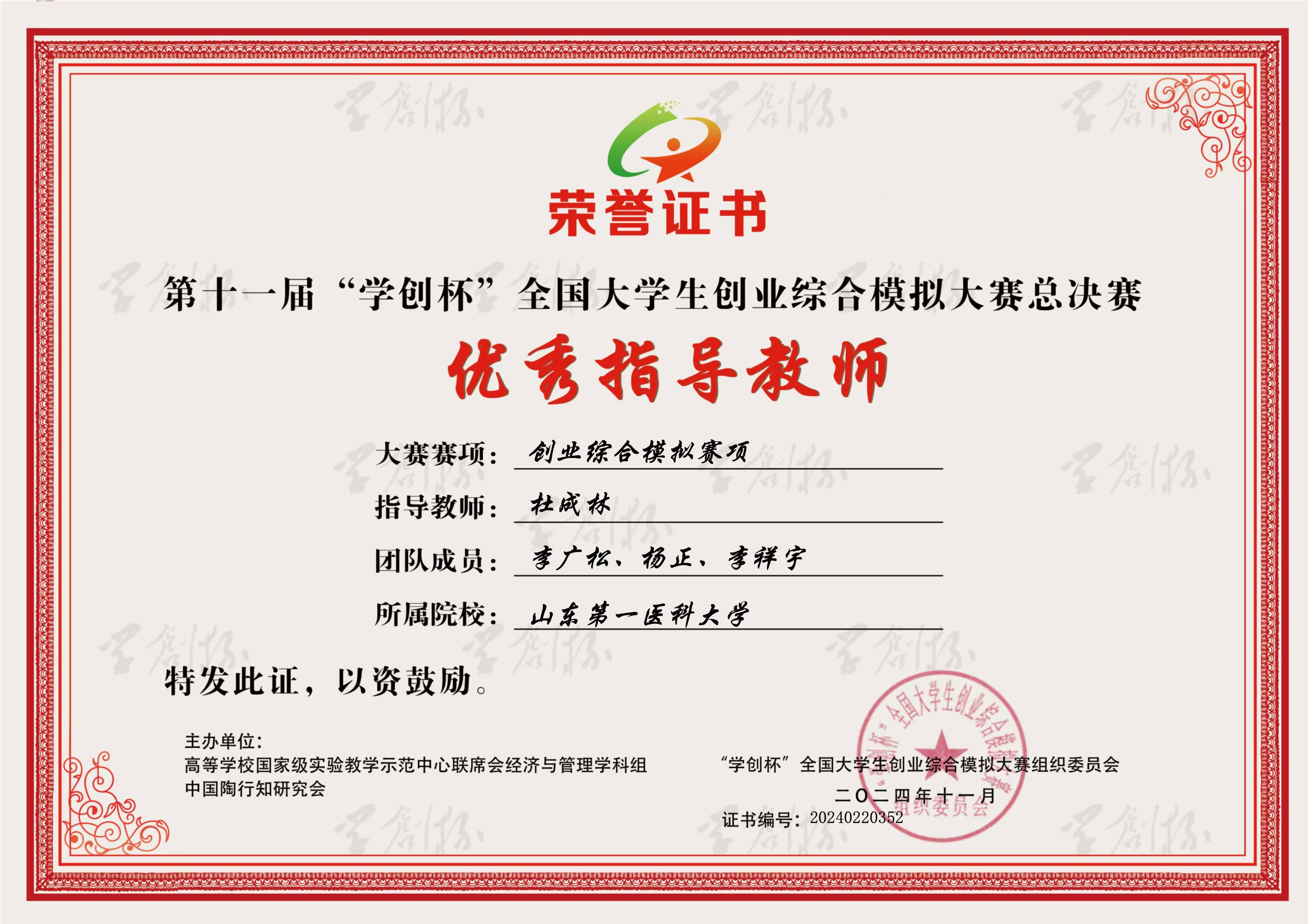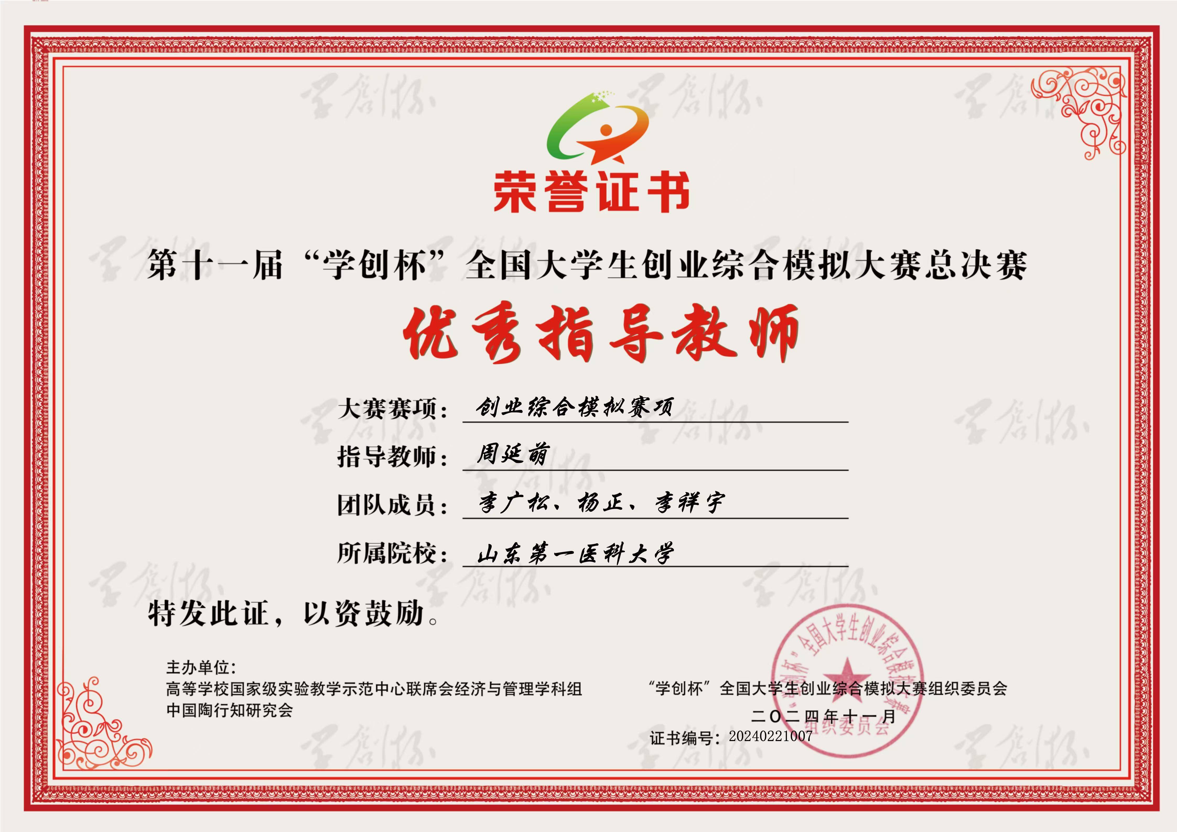 11月3日,由高等学校国家级实验教学示范中心联席会经济与管理学科组主办,徐州医科大学承办,杭州贝腾科技有限公司协办的第十一届“学创杯”全国大学生创业综合模拟大赛总决赛(本科组)圆满落幕。总决赛共300支队伍竞技,来自药学院(药物研究所)的“输赢都去开派队”(李广松、杨正、李祥宇,指导老师:杜成林、周延萌)获得全国总决赛(本科组)二等奖。两位指导老师分获总决赛“优秀指导教师”称号。