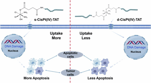 课题组还围绕靶向多肽修饰密度与铂药活性的构效关系开展了更深入的研究。Pt(IV)前药的轴向配体修饰是实现靶向递送、药效优化的核心策略。然而靶向配体的修饰密度与药物细胞摄取、还原活化、抗肿瘤活性之间的内在关联尚不明确。因此,课题组通过分子设计与反应条件调控,分别合成了单分子TAT多肽修饰的s-CisPt (IV)-TAT与双分子TAT多肽修饰的d-CisPt (IV)-TAT两种Pt (IV)前药,并系统对比了两者的理化性质、细胞毒性、摄取效率与抗肿瘤作用机制。研究结果表明,双分子多肽修饰的Pt(IV)药物产生更高的空间位阻,降低了肿瘤细胞对药物的摄取效率,最终导致细胞核内铂含量、DNA结合效率与DNA损伤能力显著低于单取代药物。该研究首次系统揭示了核靶向多肽修饰的Pt(IV)药物的结构-活性关系,为多肽偶联化疗药物的理性设计中功能密度与生物学性能的平衡提供了重要的理论参考与实验依据。相关成果近期以研究论文的形式发表在Molecular Pharmaceutics期刊(图2)。