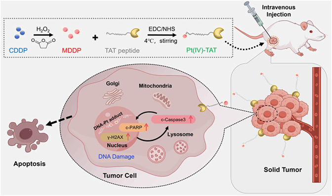 图1. Pt (IV)-TAT药物制备过程及低毒靶向抗肿瘤机制示意图